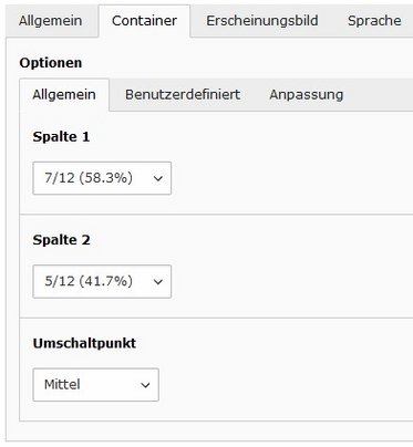 Die Standardspaltenbreite wird einfach über Auswahlfelder eingestellt. Weitergehende Anpassungen können im Tab "Benutzerdefiniert" vorgenommen werden. Siehe auch "Bootstrap grid options".